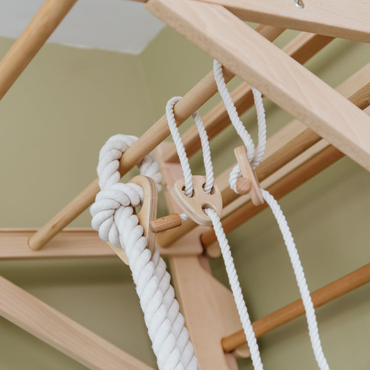 For smaller options, such as a Montessori climbing set or a triangle inspired by Emmi Pikler, you can even move it from room to room depending on the circumstances. For instance, if your older child wants to play but the younger one needs to nap, you can simply transfer the wooden climber to another room.