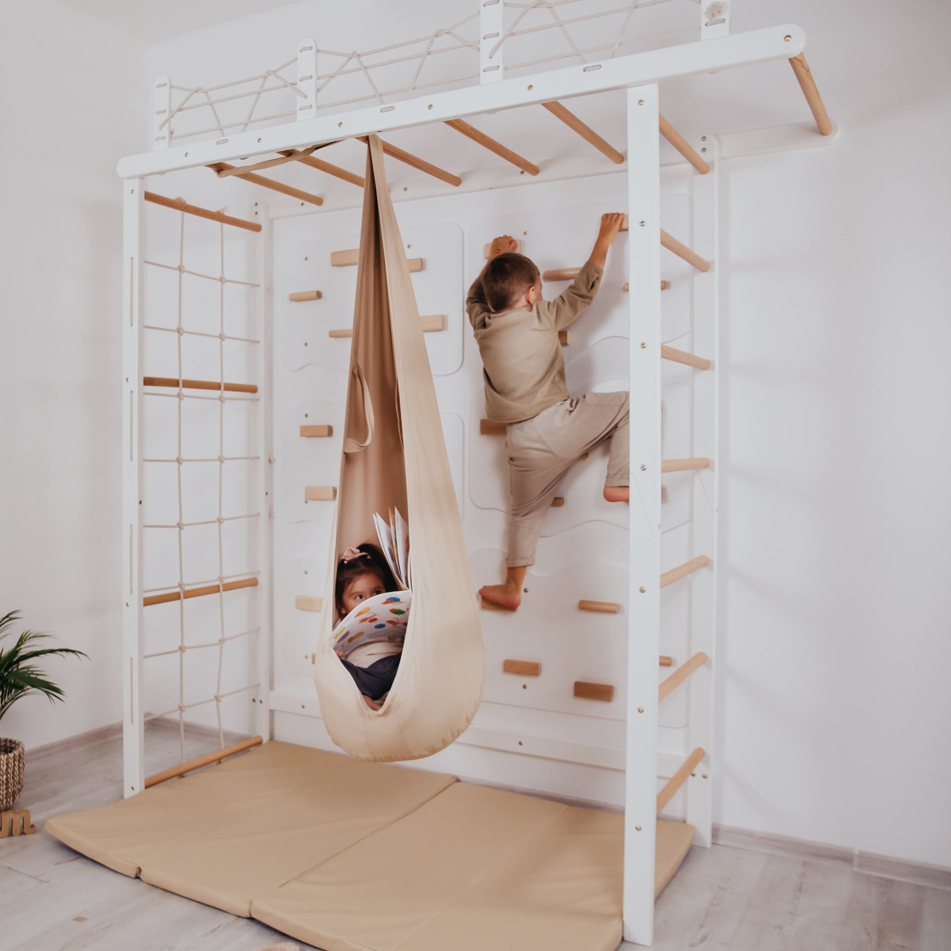 Complete set including: Climbing Monkey Bars (white + natural wood), indoor rock wall (6 panels, color selectable), swings set, pod swing (color selectable), and gymnastics mat.