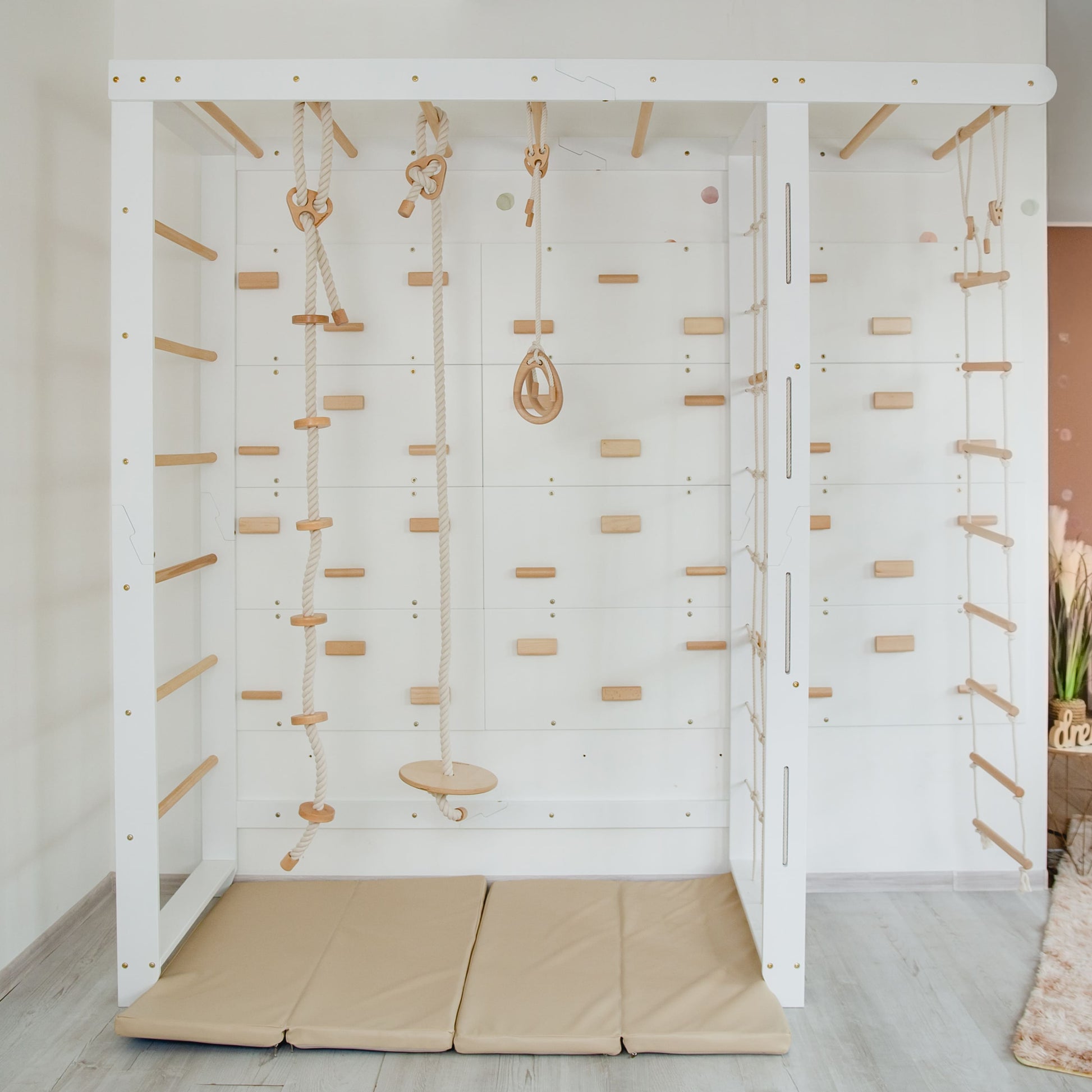 The set includes indoor monkey bars (white + natural wood), a 12-panel climbing wall (color selectable), a swings set (ladder, rings, rope, disc swing), a pod swing(color selectable), and a gymnastics mat.