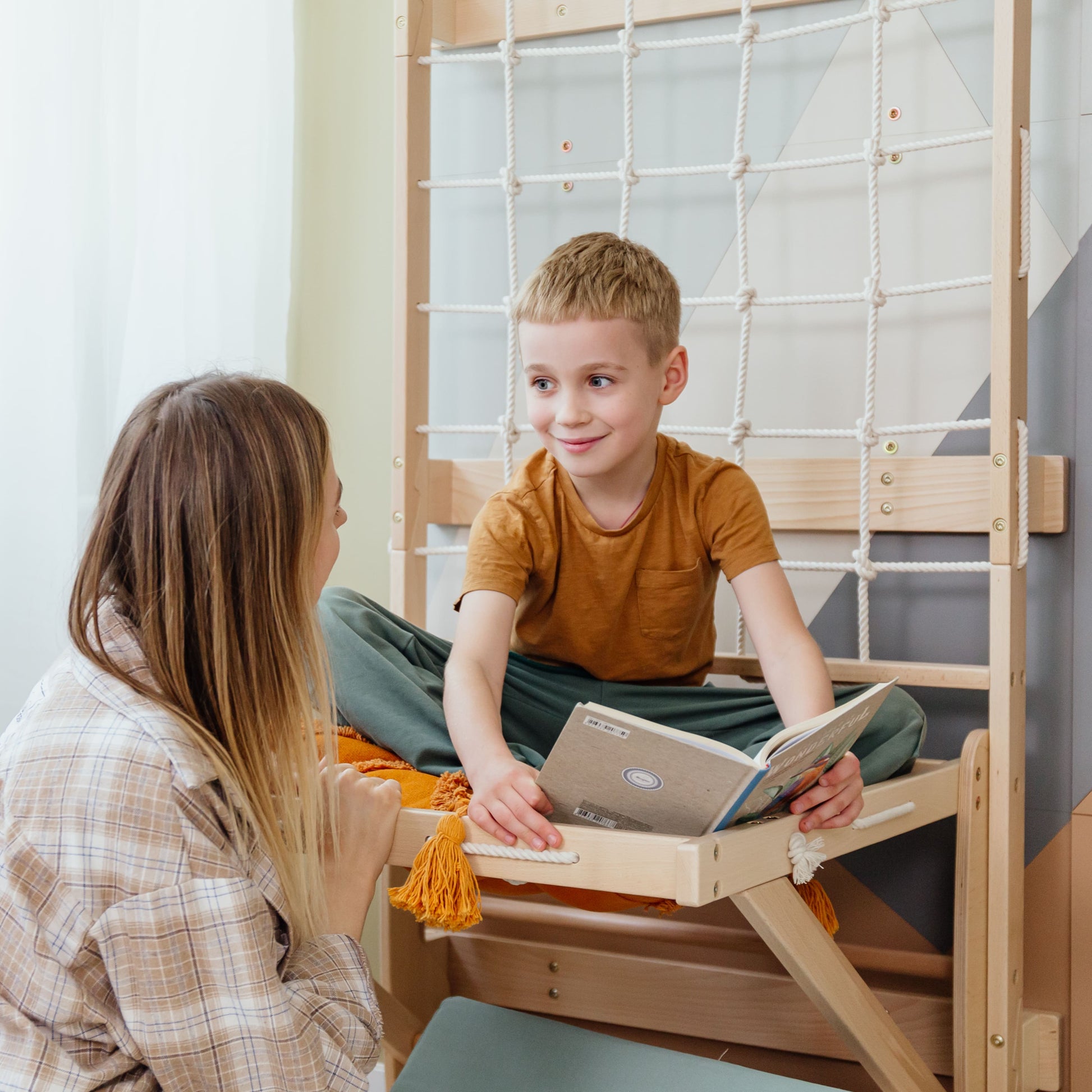 The Rope Seat for Swedish Ladder transforms a Childrens climbing net or Swedish ladder wall set into a cozy, multifunctional space where kids can take a break while staying close to their favorite activity.