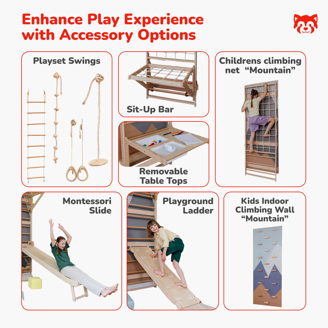 • Versatility: More fun activities with additional accessories, such as climbing ropes, slide or removable tabletops.