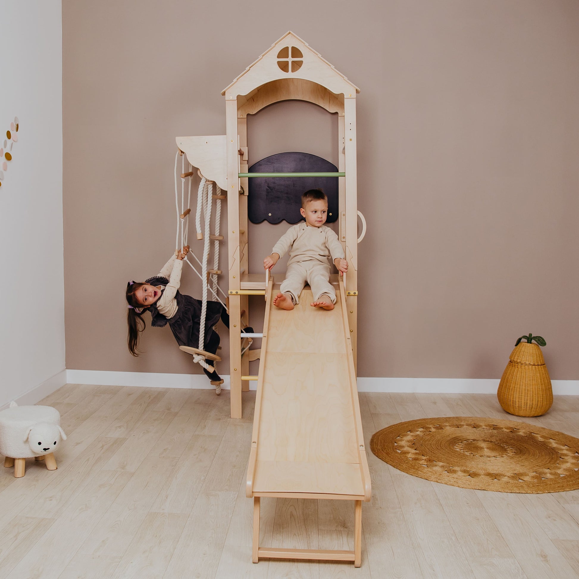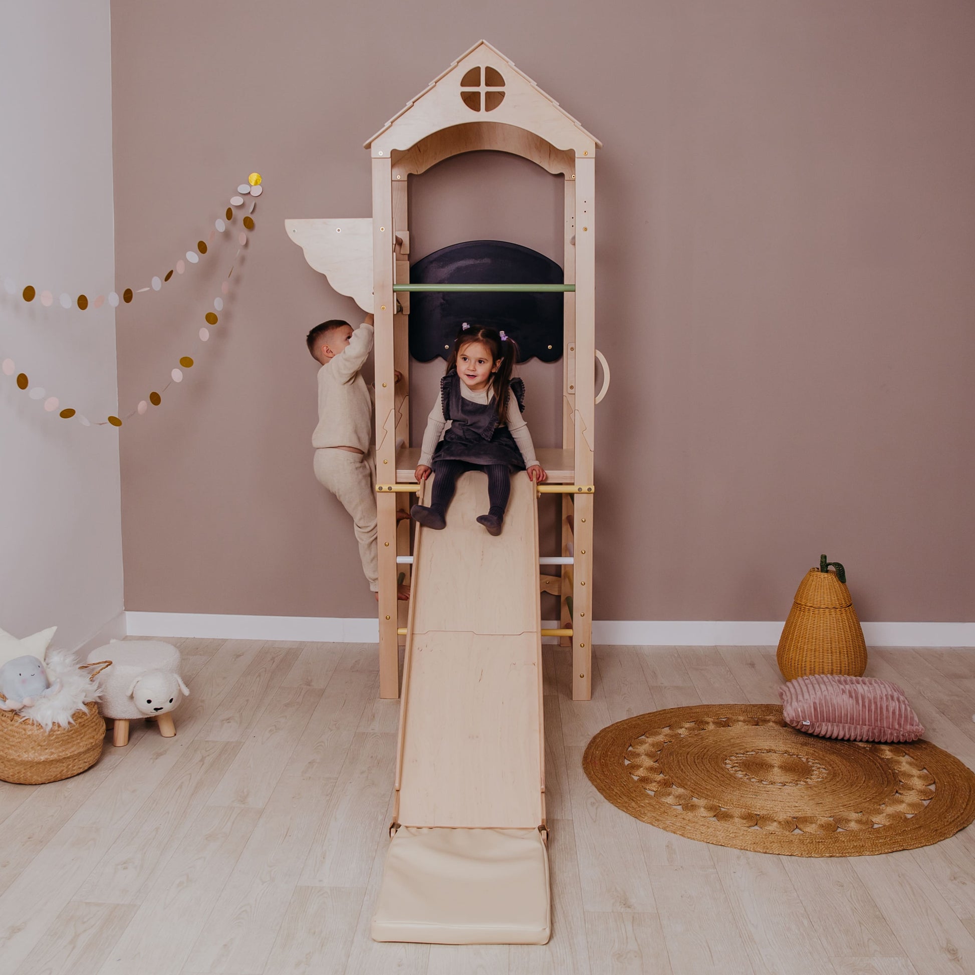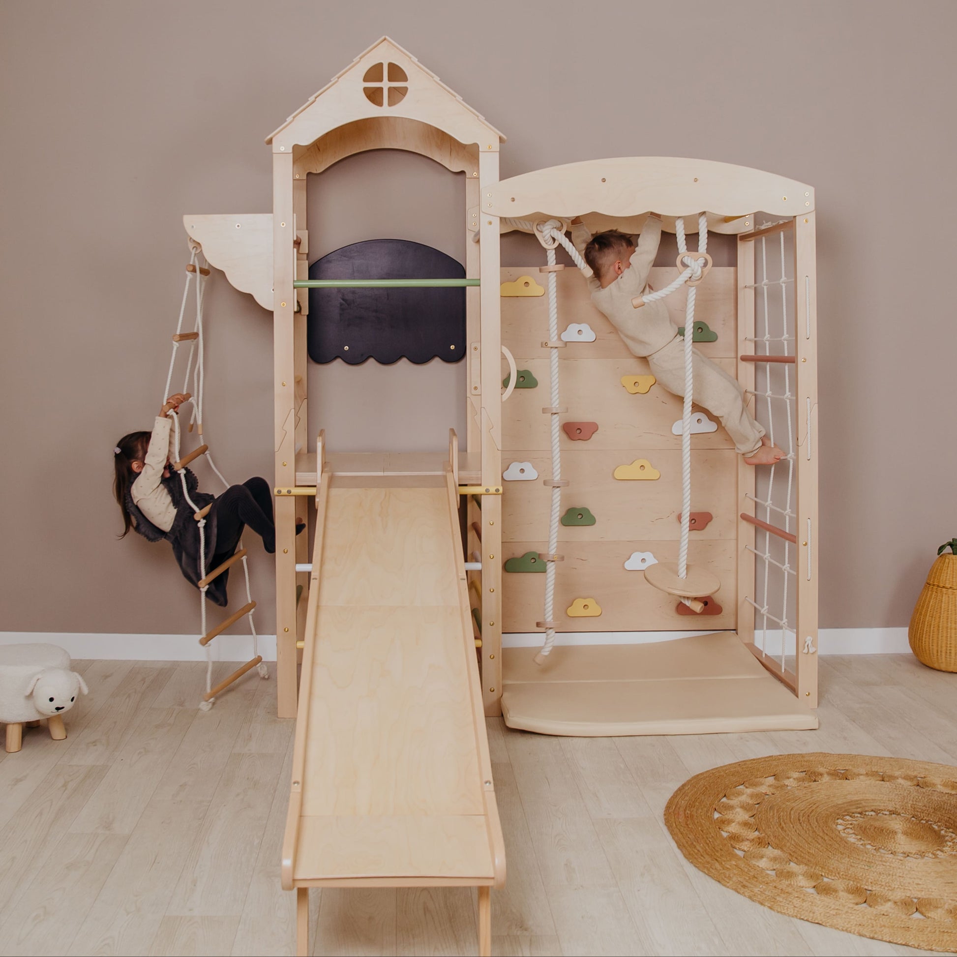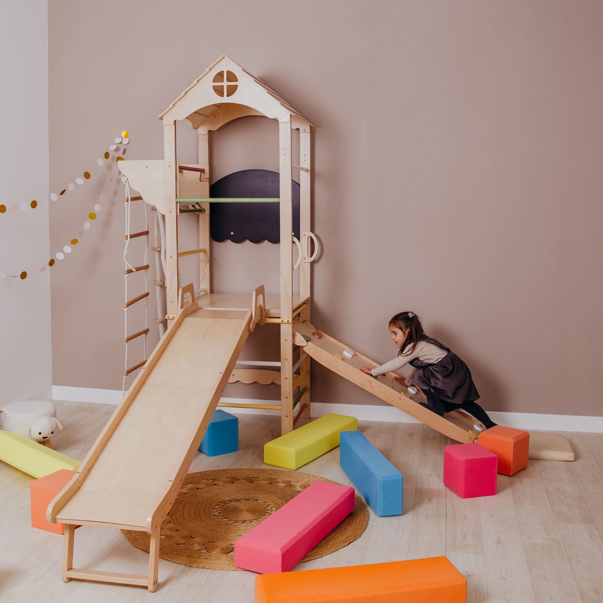 Montessori-inspired indoor playground with Mini and Large Tower options, supporting active play, motor development, and independent exploration at home.