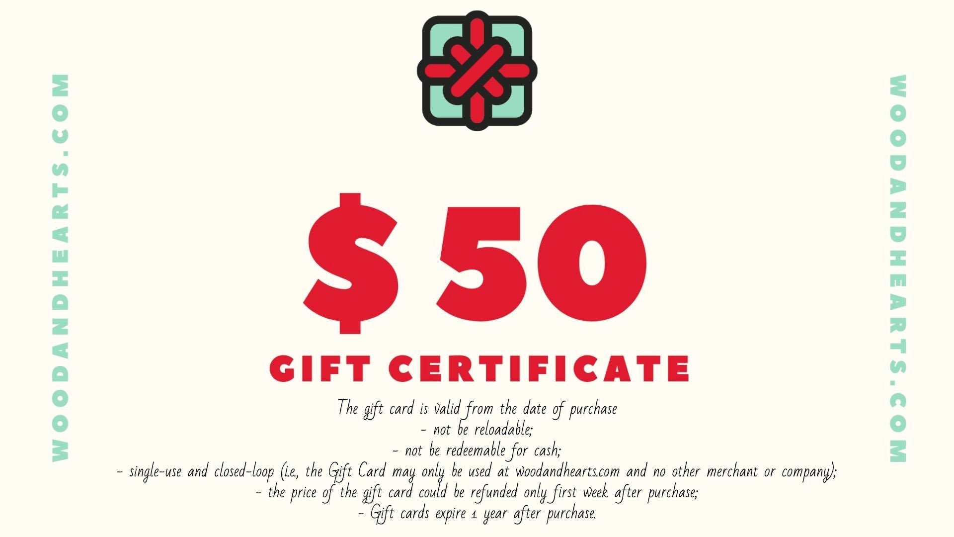 - single-use and closed-loop (i.e., the Gift Card may only be used at woodandhearts.com and no other merchant or company).