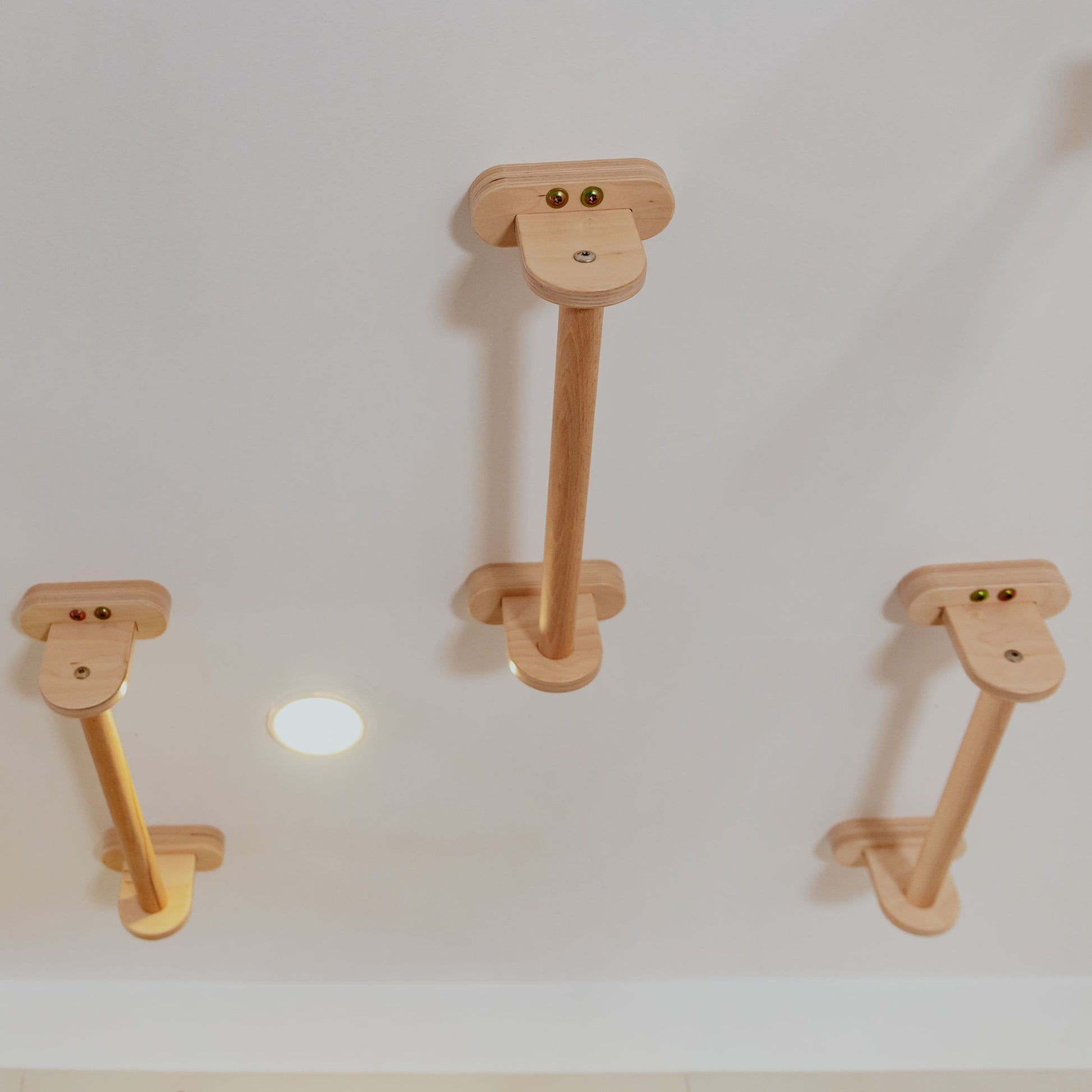 To install the Monkey Bars Kit, make sure the wall or ceiling is strong enough to support the weight. Follow the included step-by-step installation instructions for secure mounting. Please note, according to international standards, the bars should be installed with a distance of less than 9 cm or more than 20 cm between each other for optimal safety and functionality.
