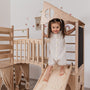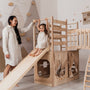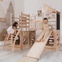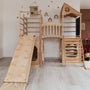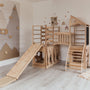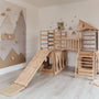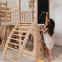 The playground for climbing features wooden ladders, a semi-arch, a safe bridge between two Tower parts, and even a drawing board. Two cozy houses with curtains are located on the lower level, providing a secure space for imaginative play. This functional design offers safe opportunities for play, with the position of the climbing arch being adjustable. The play complex can be easily complemented with a ramp-slide, and soft mats for cozy and safe play, adding even more fun and adventure to the climber.