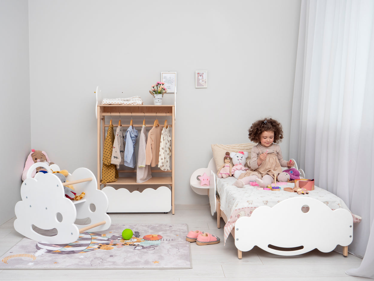 垂れ下がった衣類の棒を備えた子供向けのワードローブは、ドレッシングスキルを促進します。これらの要素は、子どもたちが自分の環境を担当し、全体的な成長を促進できるようにします。