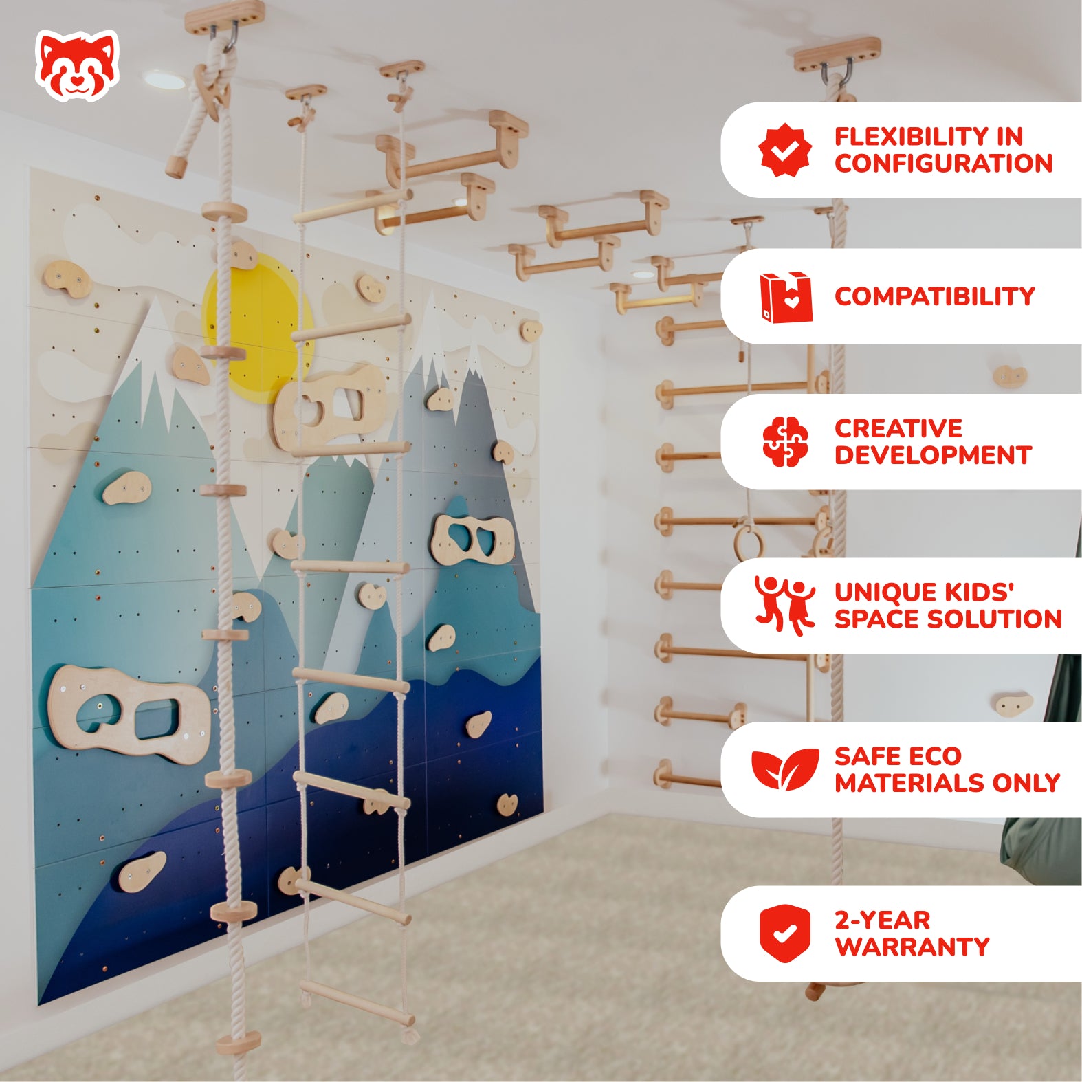 Wall panels are made of premium-grade composite wood with usage of eco-friendly paints and finishes. Climbing elements are made of beech wood and birch plywood. The materials taken ensure a safe and enjoyable play experience for your child.