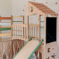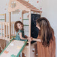 The playground for climbing features wooden ladders, a semi-arch, a safe bridge between two Tower parts, and even a drawing board. Two cozy houses with curtains are located on the lower level, providing a secure space for imaginative play. This functional design offers safe opportunities for play, with the position of the climbing arch being adjustable. The play complex can be easily complemented with a ramp-slide, and soft mats for cozy and safe play, adding even more fun and adventure to the climber.