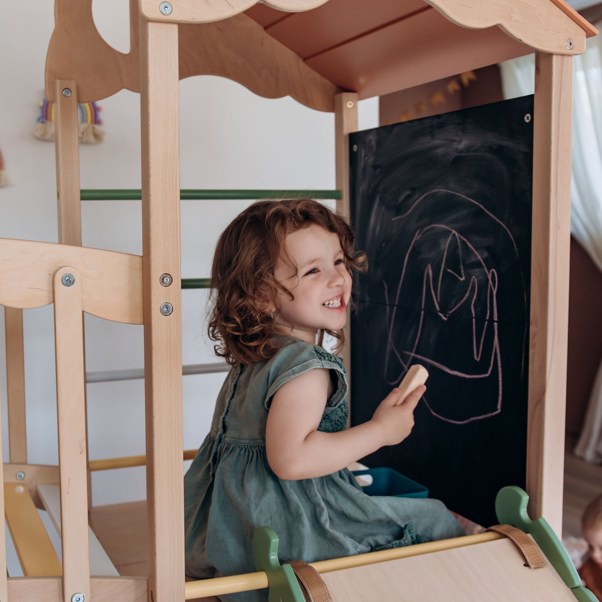 The playground for climbing features wooden ladders, a semi-arch, a safe bridge between two Tower parts, and even a drawing board. Two cozy houses with curtains are located on the lower level, providing a secure space for imaginative play. This functional design offers safe opportunities for play, with the position of the climbing arch being adjustable. The play complex can be easily complemented with a ramp-slide, and soft mats for cozy and safe play, adding even more fun and adventure to the climber.