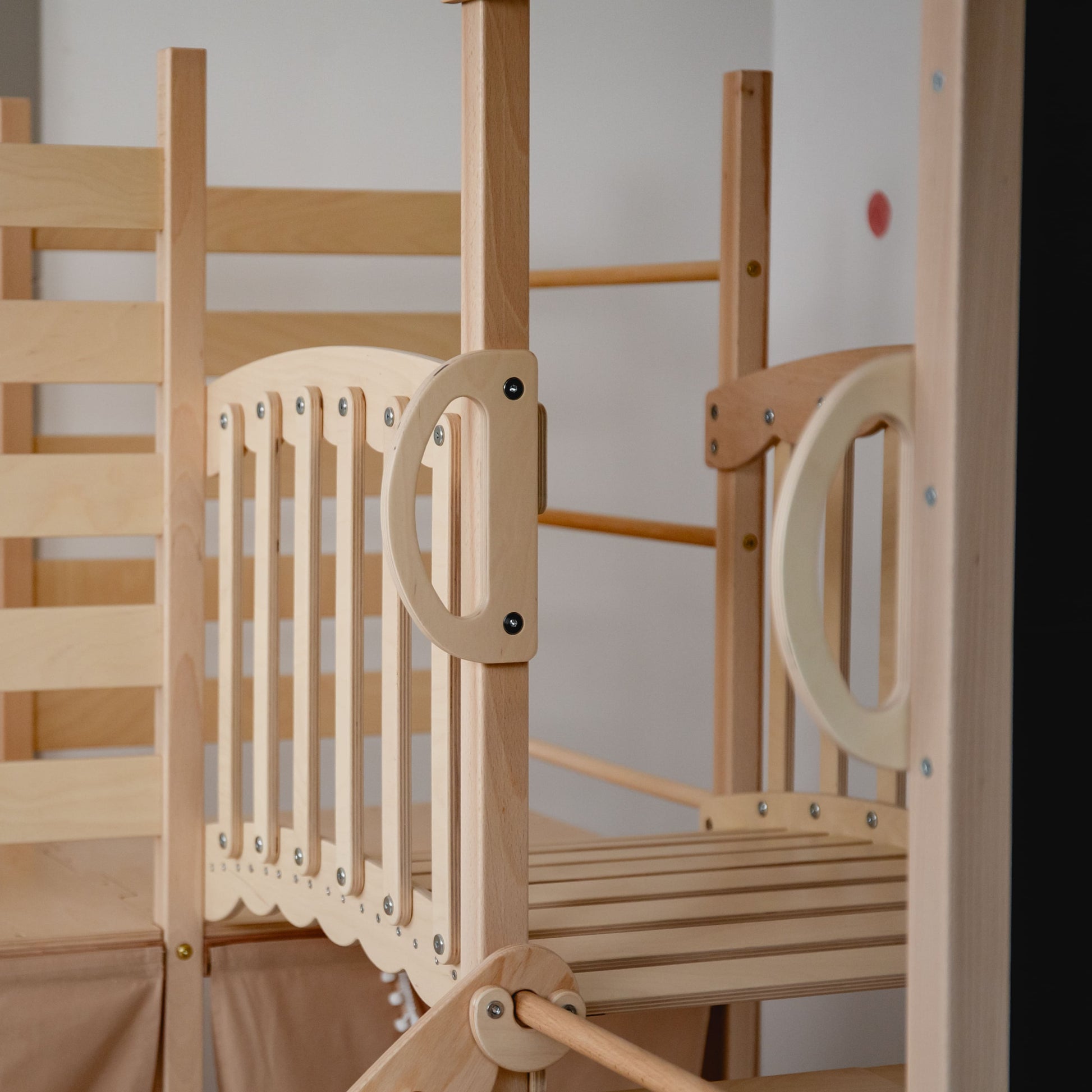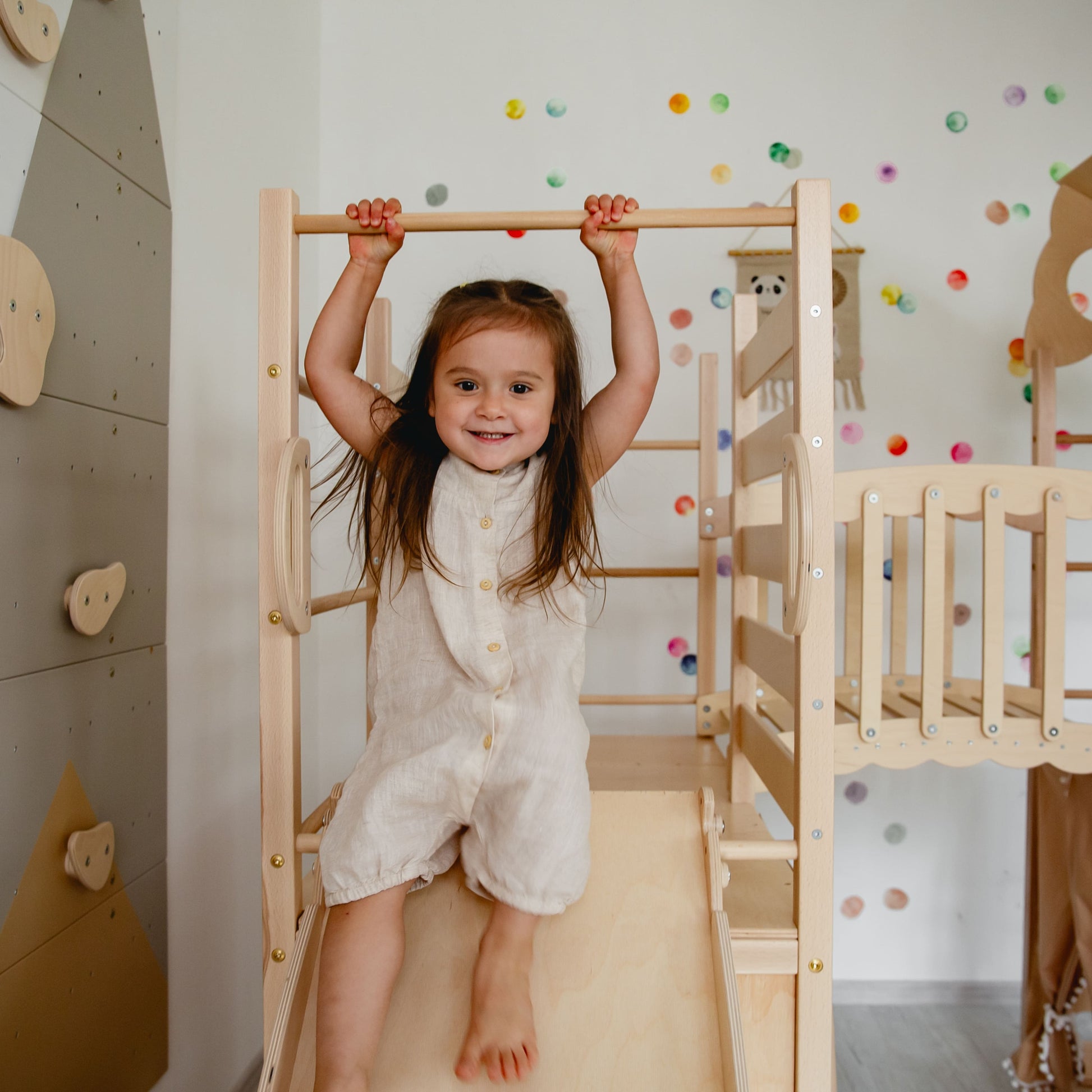 The Montessori climbing semi-arch is typically attached to the structure using durable wooden hooks, ensuring it remains stable and secure during active play sessions. It can be fixed on different sides of the indoor playground, giving an opportunity for diverse playtime or perfectly fitting the indoor jungle gym in the kids’ room area. Follow the instructions to the arch attachment and minimize any instability-related safety risks properly.