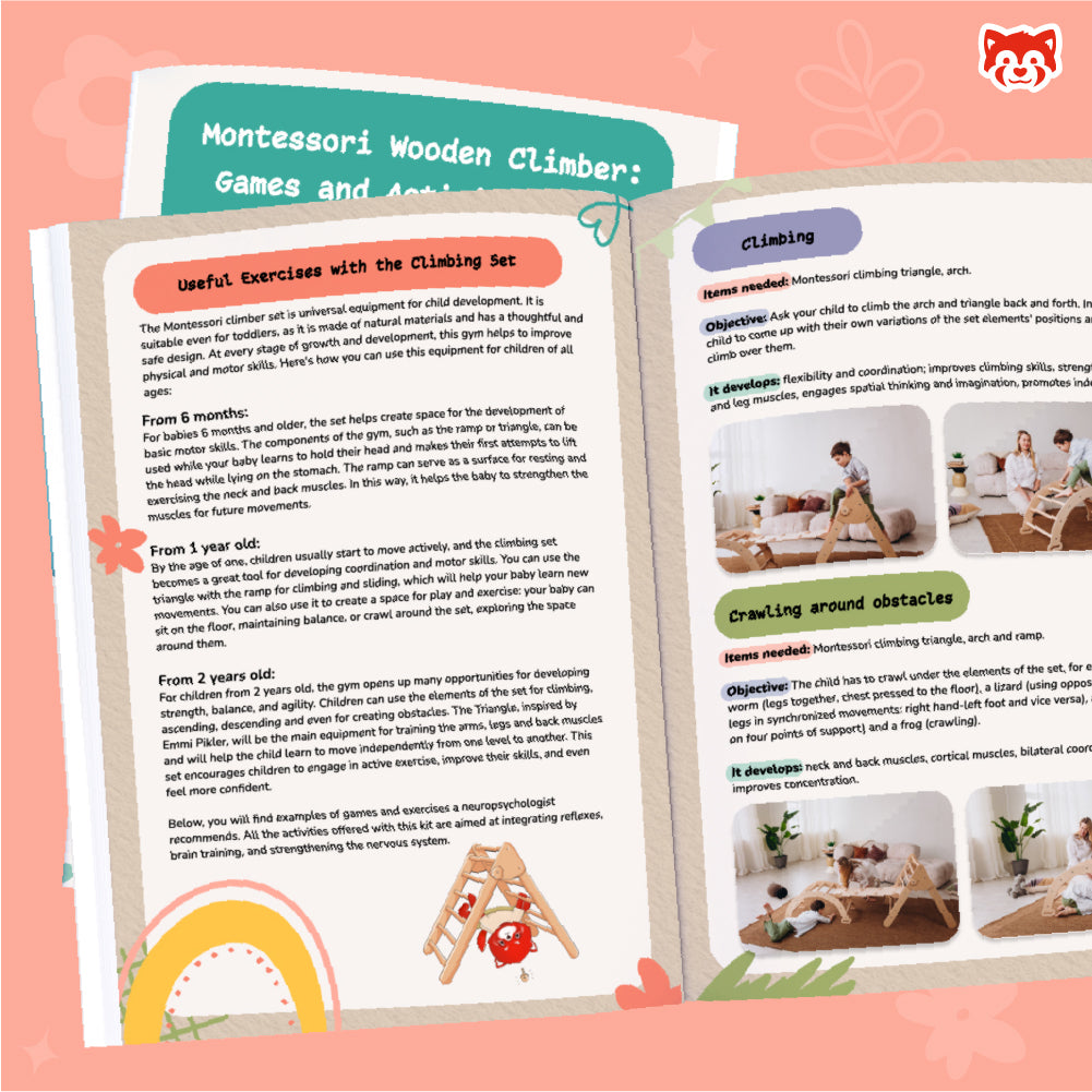 Discover a book that will give you a fresh perspective on the possibilities of a Montessori wooden climber. Even if you already own a set of a triangle, arch, and ramp at home, and your child enjoys playing with them, you will find plenty of new, exciting, and useful ideas here. The material for this e-book has been developed in close collaboration with a neuropsychologist. Expert advice, tested in real-life settings, is gathered in one format to provide your little ones with the best and most effective exercises, games, and activities.